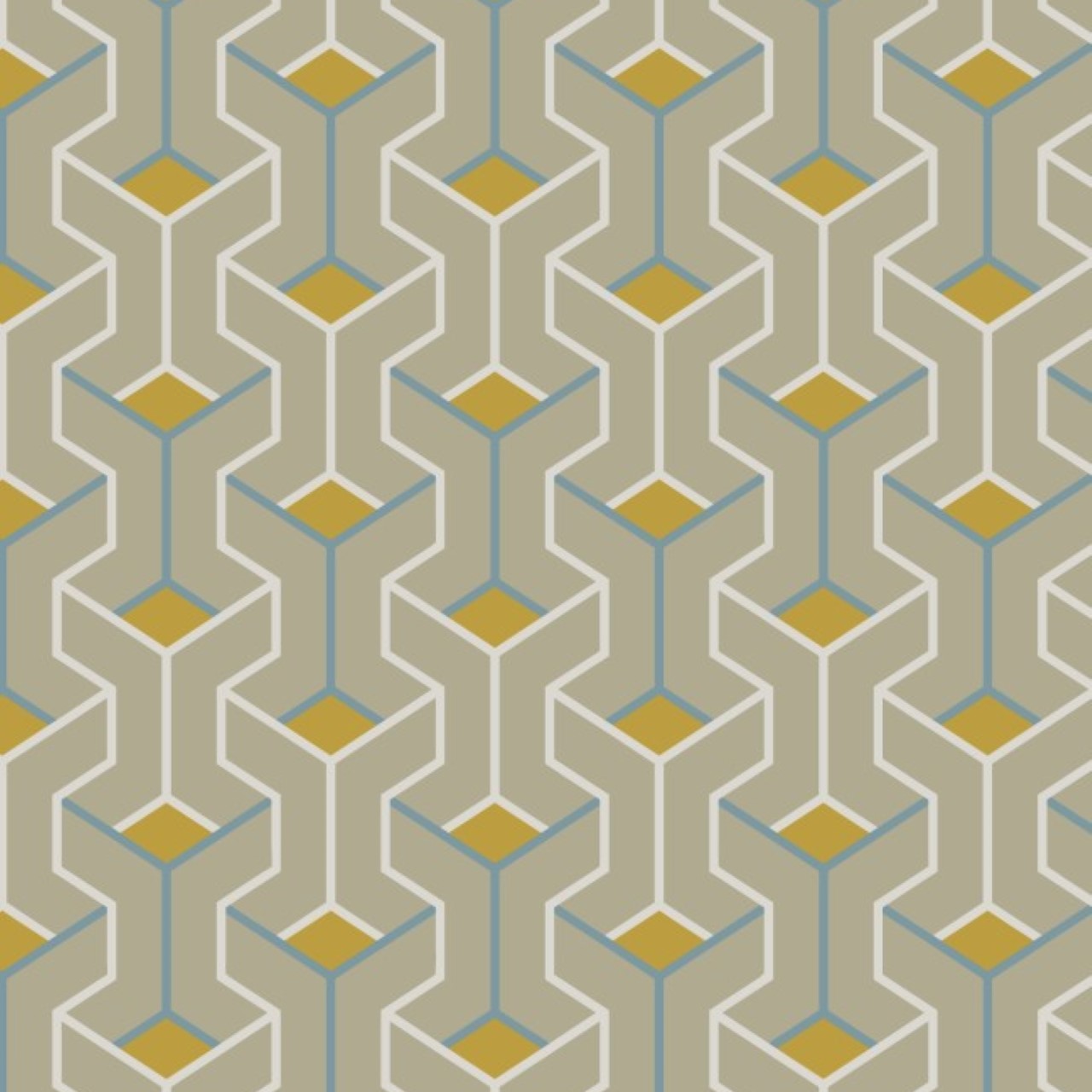 Cubes drop into cubes creating a striking repeat. Strong colours enhance this dramatic geometric statement.