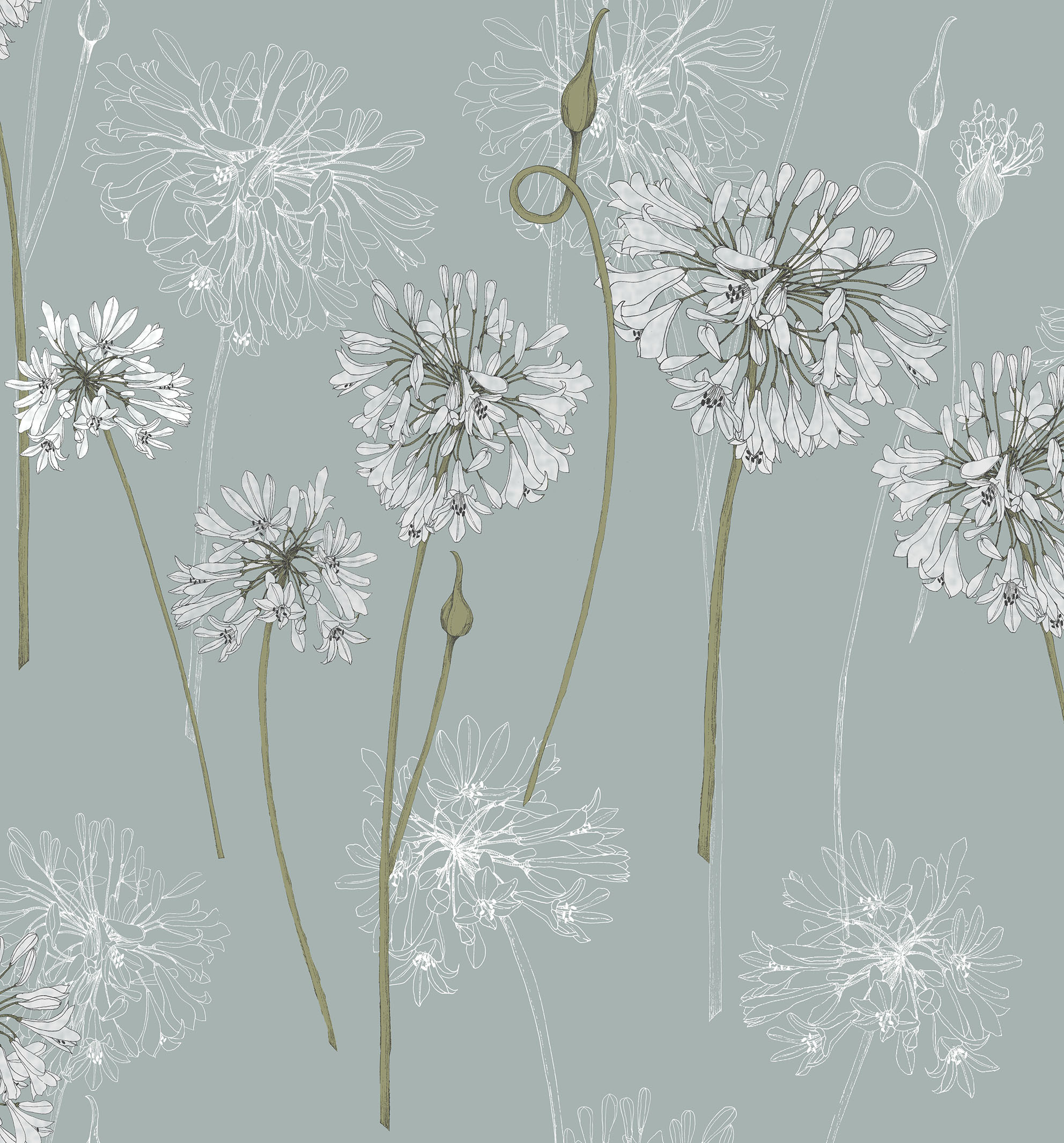 YUNNAN - Big bold Agapanthus flora is all that is required to make this design a stunning addition to the collection, and to any interior wall. Inspired by the mythical world of Shangri-La; this collection brings to life the lost world by way of floral metaphors that would have adorned the valleys and surrounding peaks of its snowy mountains.