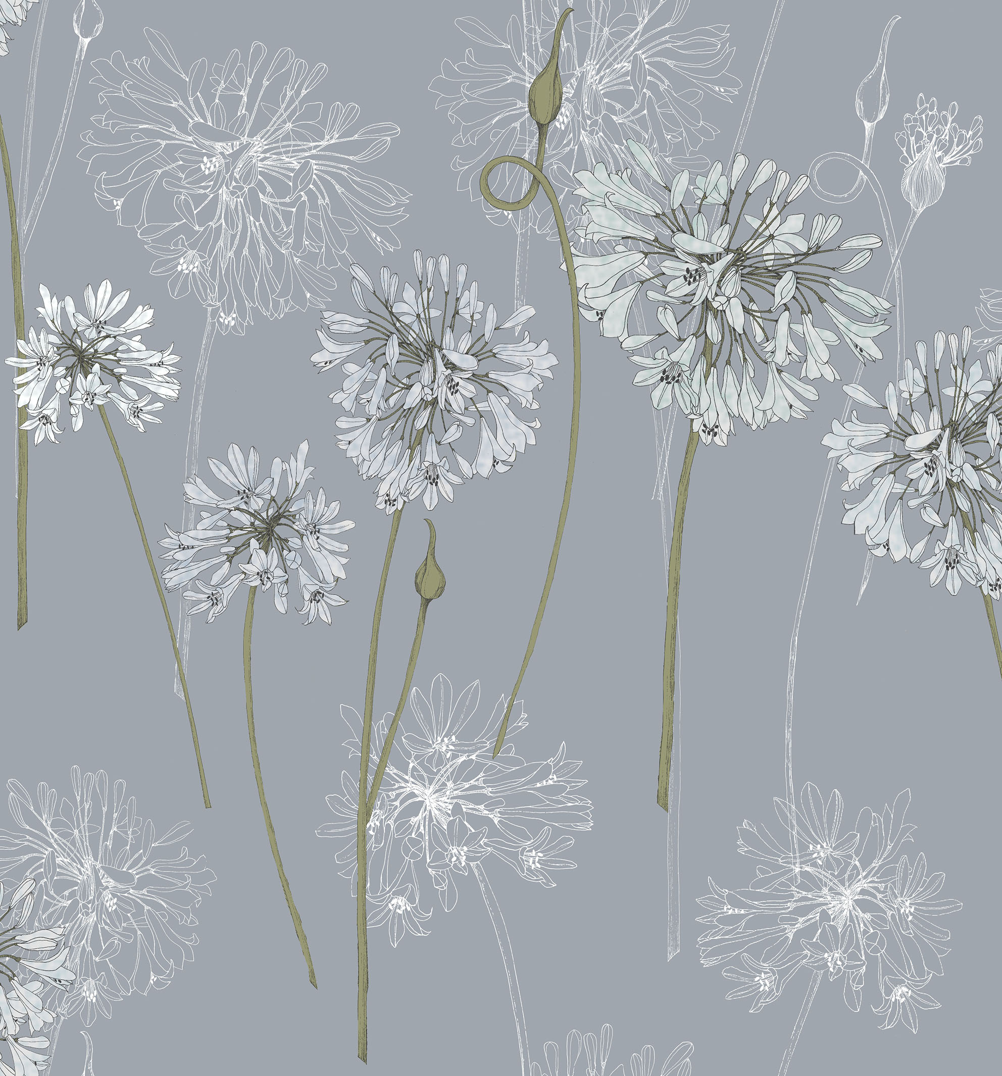 YUNNAN - Big bold Agapanthus flora is all that is required to make this design a stunning addition to the collection, and to any interior wall. Inspired by the mythical world of Shangri-La; this collection brings to life the lost world by way of floral metaphors that would have adorned the valleys and surrounding peaks of its snowy mountains.