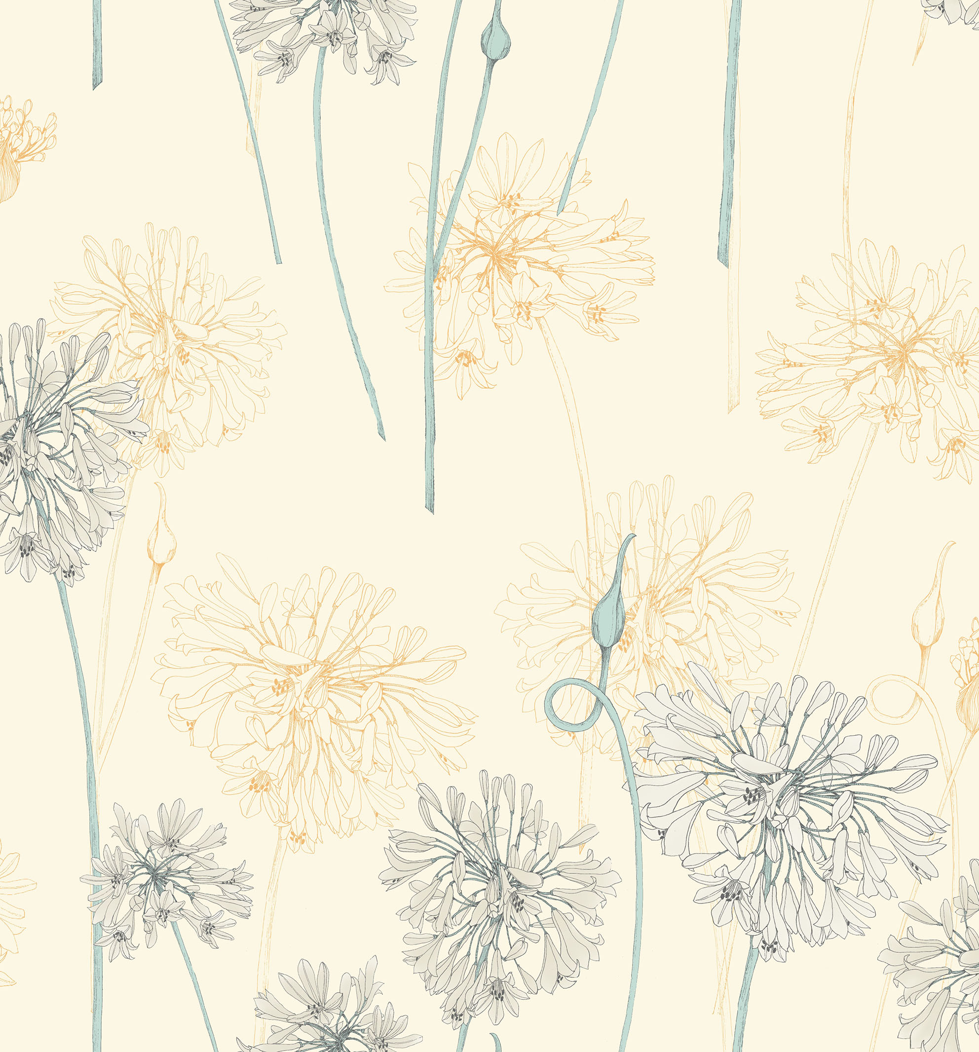 YUNNAN - Big bold Agapanthus flora is all that is required to make this design a stunning addition to the collection, and to any interior wall. Inspired by the mythical world of Shangri-La; this collection brings to life the lost world by way of floral metaphors that would have adorned the valleys and surrounding peaks of its snowy mountains.