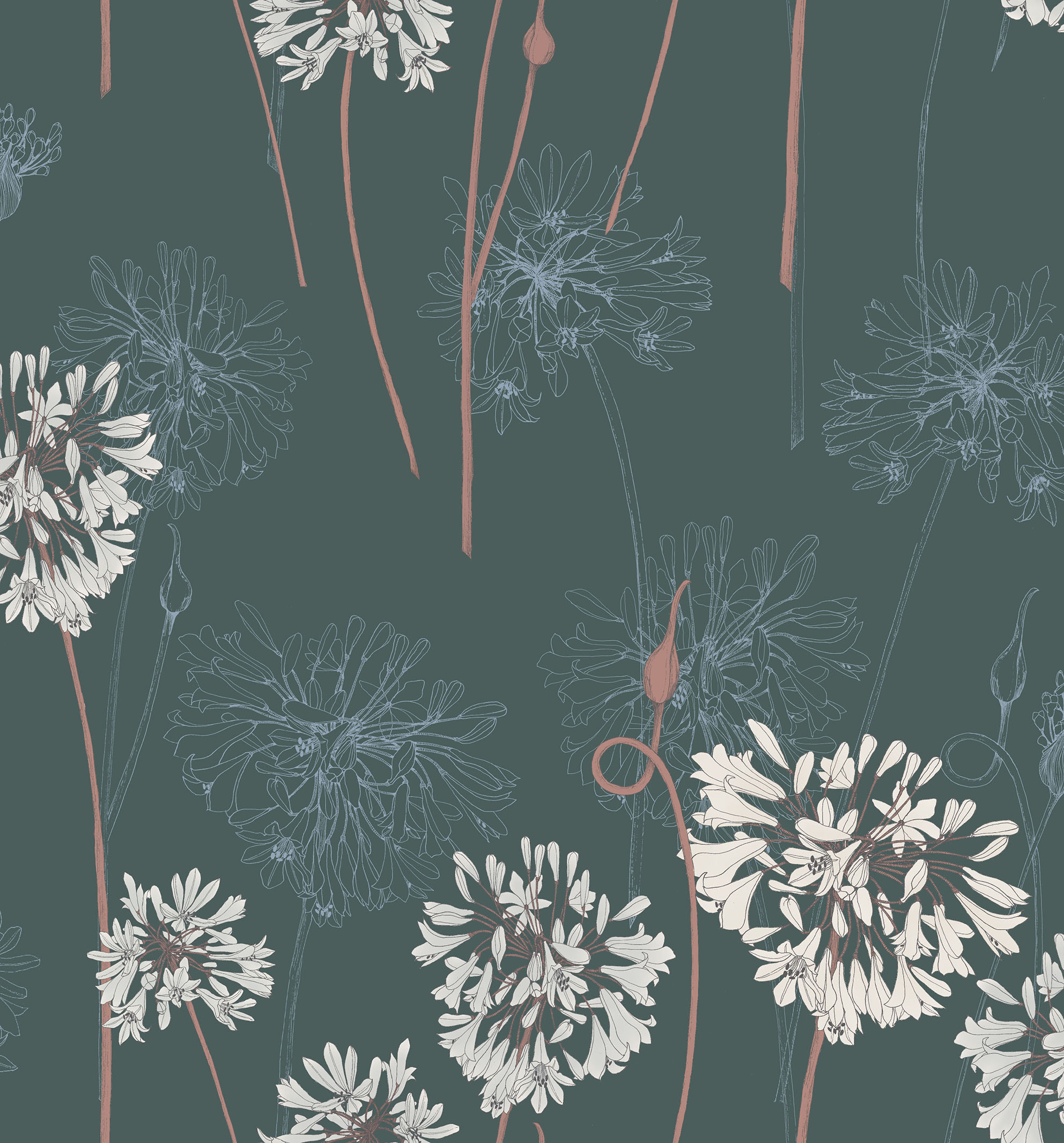 YUNNAN - Big bold Agapanthus flora is all that is required to make this design a stunning addition to the collection, and to any interior wall. Inspired by the mythical world of Shangri-La; this collection brings to life the lost world by way of floral metaphors that would have adorned the valleys and surrounding peaks of its snowy mountains.