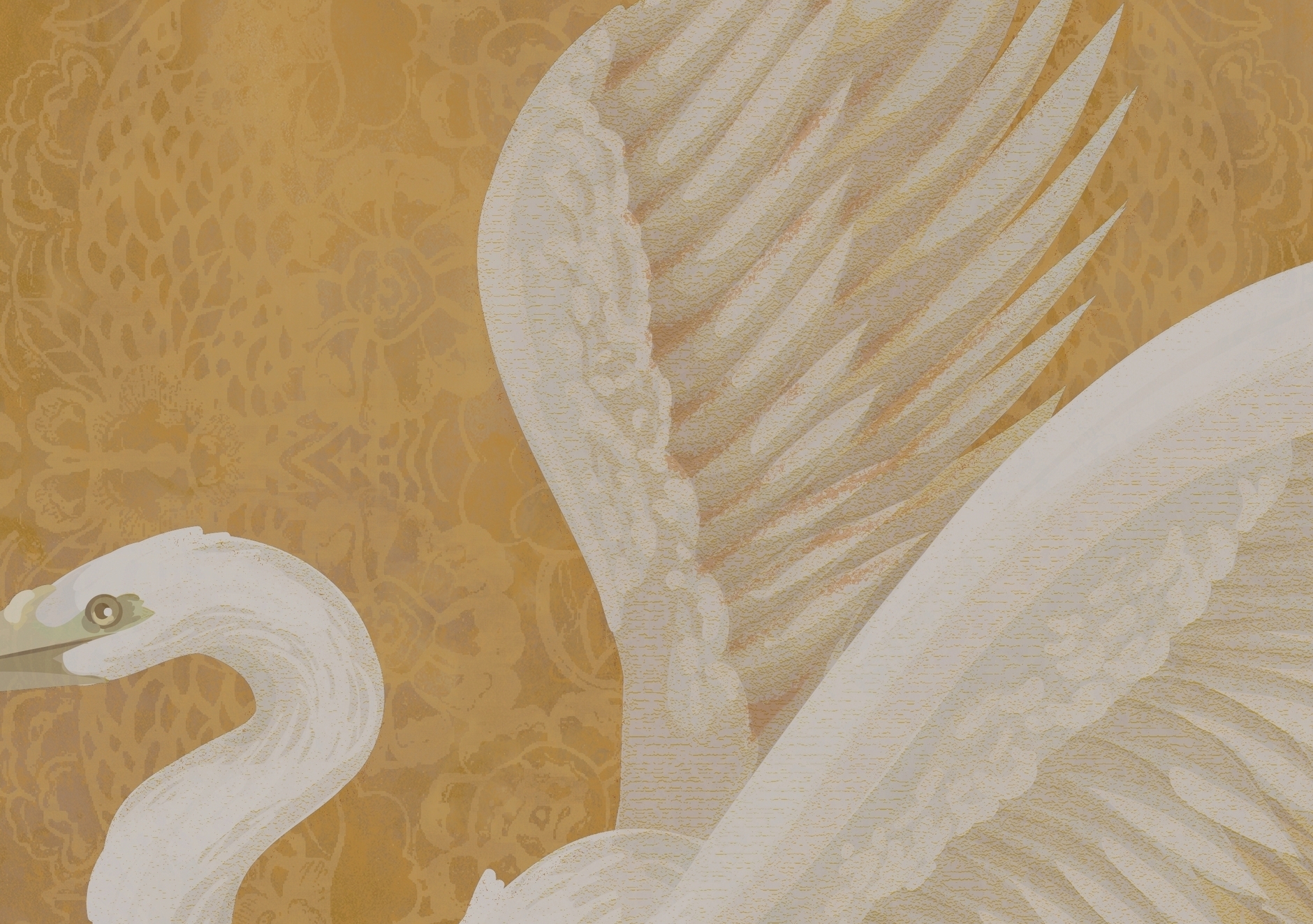 Sumatra captures the graceful movement of herons in flight, gliding across the wall with quiet elegance. Set against a softly layered backdrop, the design blends fluid lines with a balanced colour palette of appealing pastel notes and warmer accents.