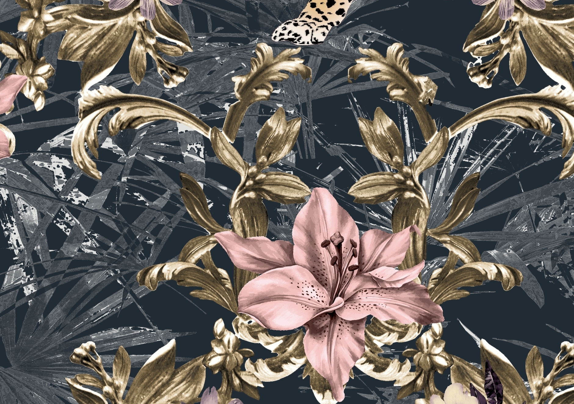 A poised leopard rests among shadowy tropical damask and hidden florals — a design that balances wild beauty with quiet luxury. Maasai comes in earthy warm neutrals and deeper, vibrant tones for bold spaces. Sophisticated. Subtle. Untamed.
